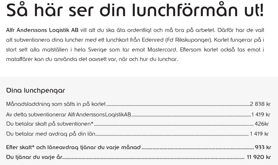Samt ytterligare en trevlig sak är om ni inte redan har sett det, att Edenred har höjt beloppet till 2838kr from januari! (samt även tagit bort 1% avgiften på de ställen det gick att använda kortet på men som ej varit anslutna till Edenred)